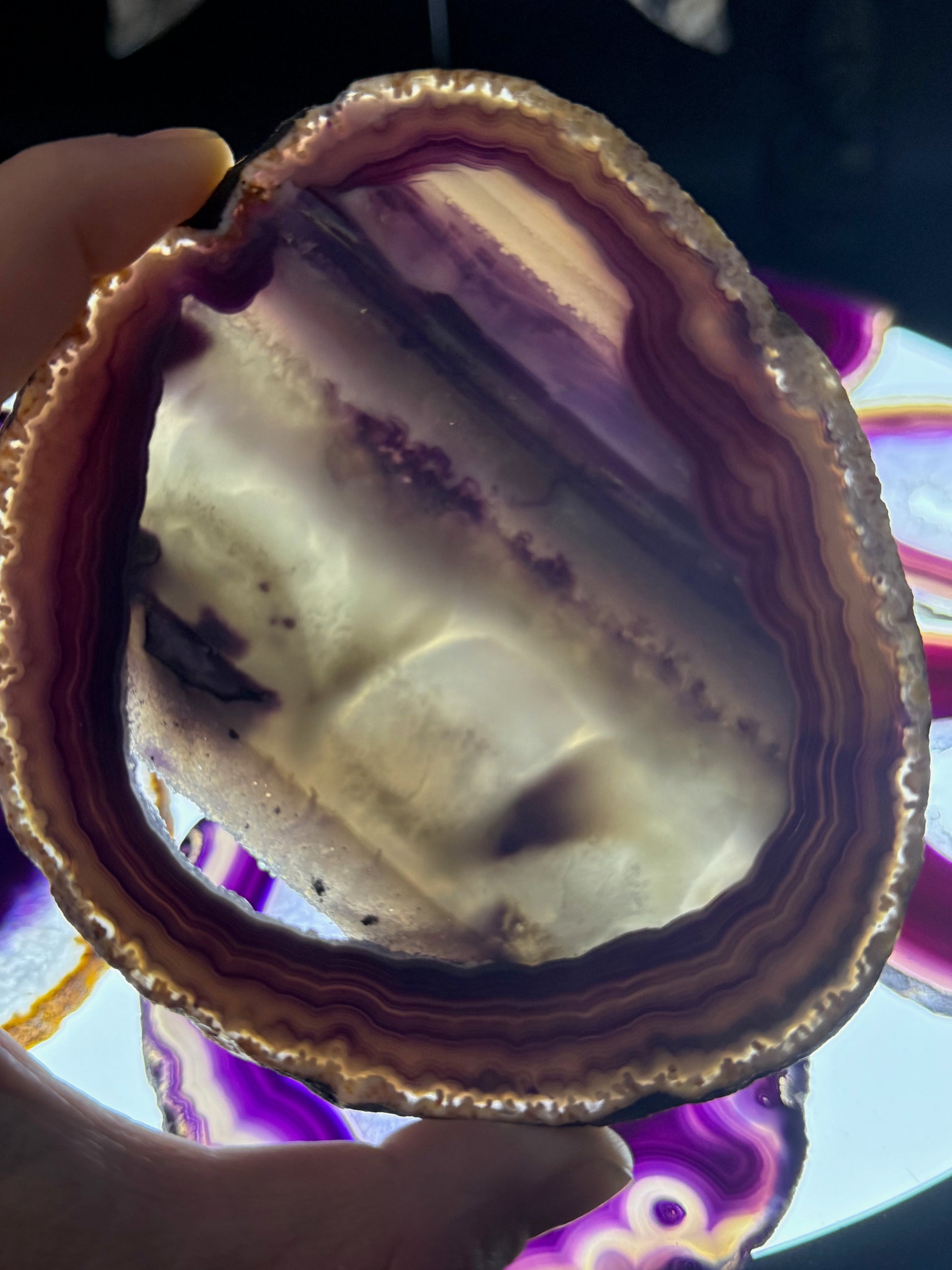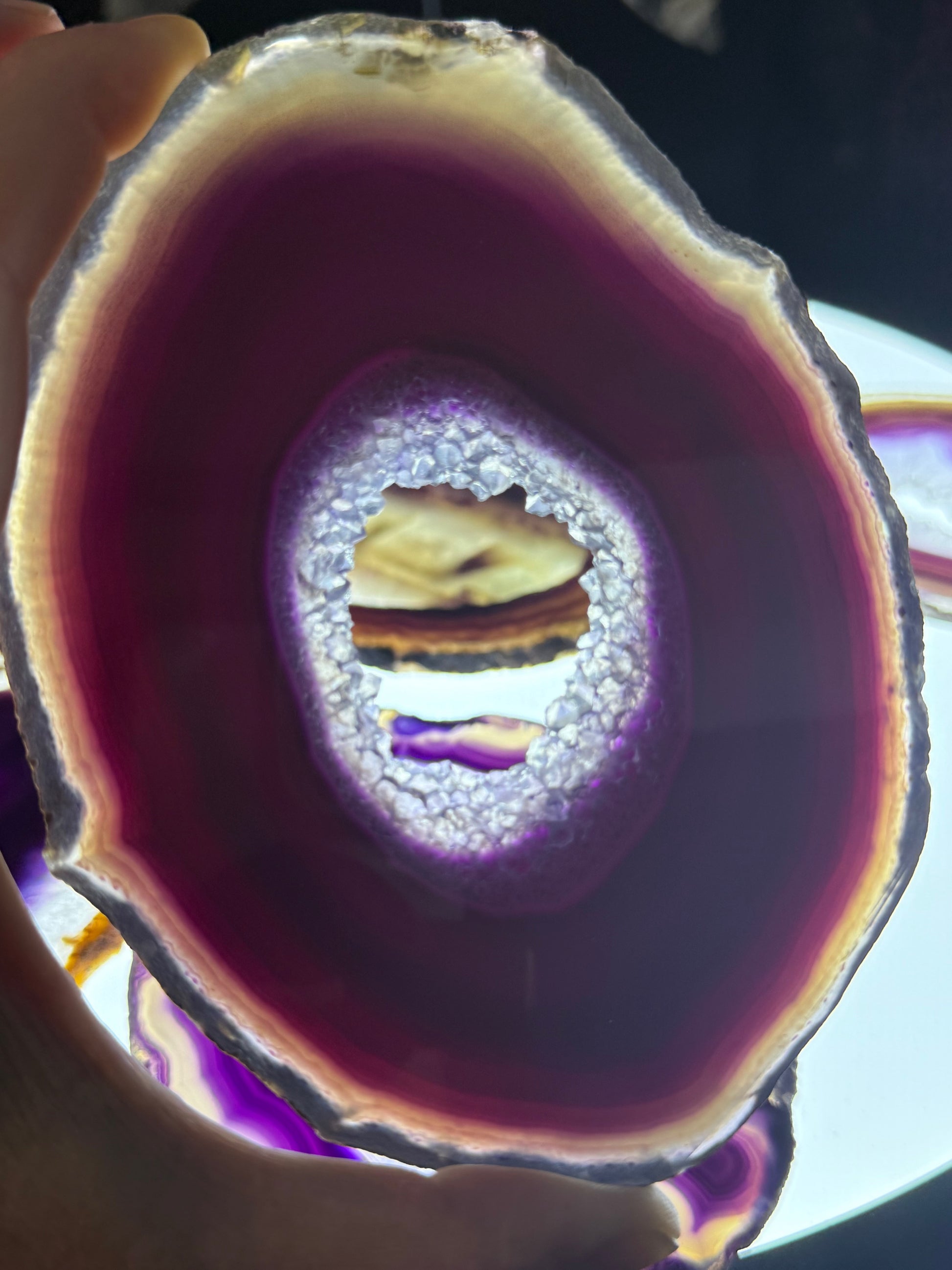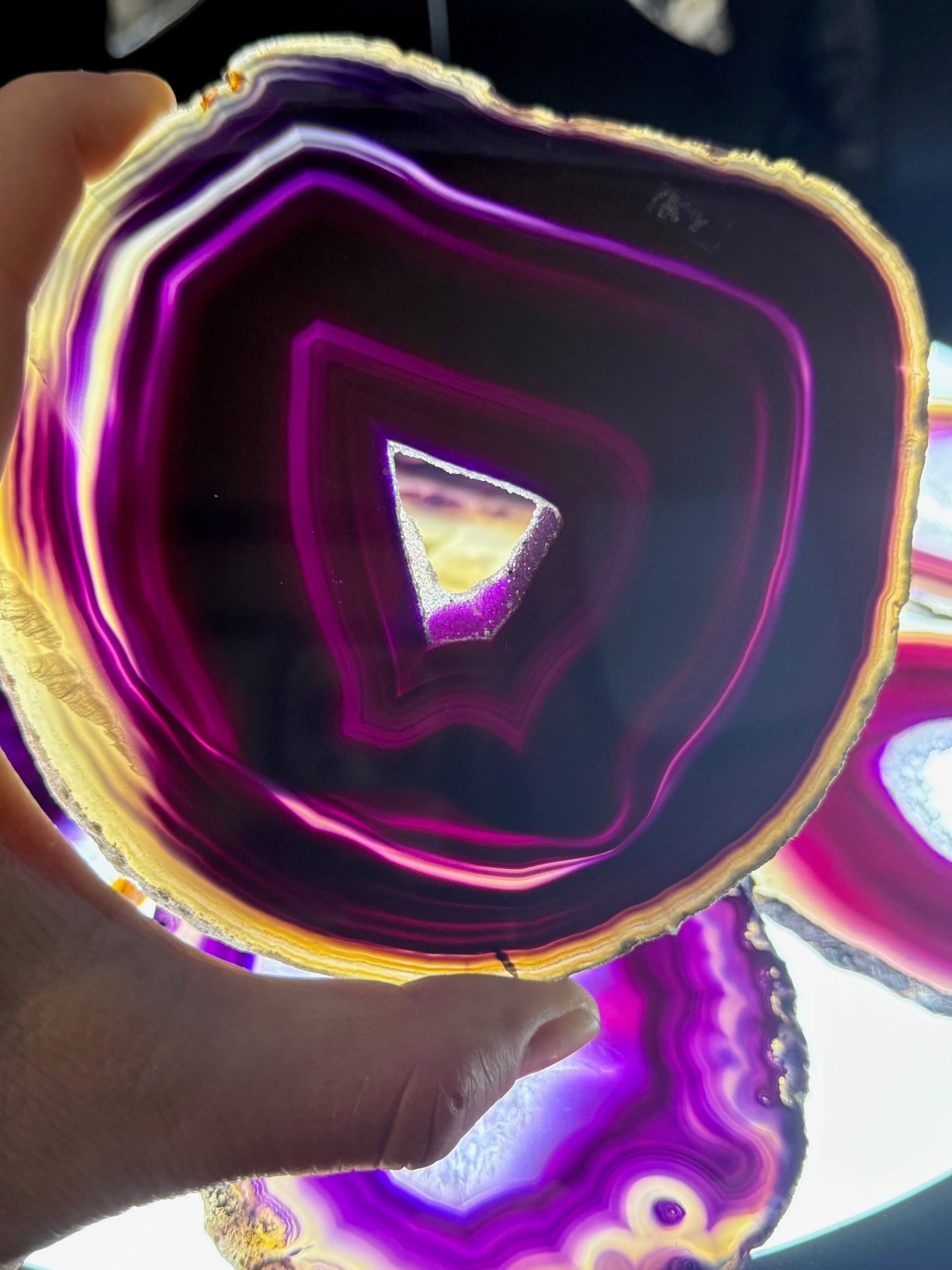 These purple dyed agate slices range from 5 to 6 inches in size, showcasing vibrant color and natural banding. Ideal for crafts, decor, or jewelry, each slice brings a touch of natural elegance. Available at $5.00 per slice, they offer an affordable way to enhance your creative projects.